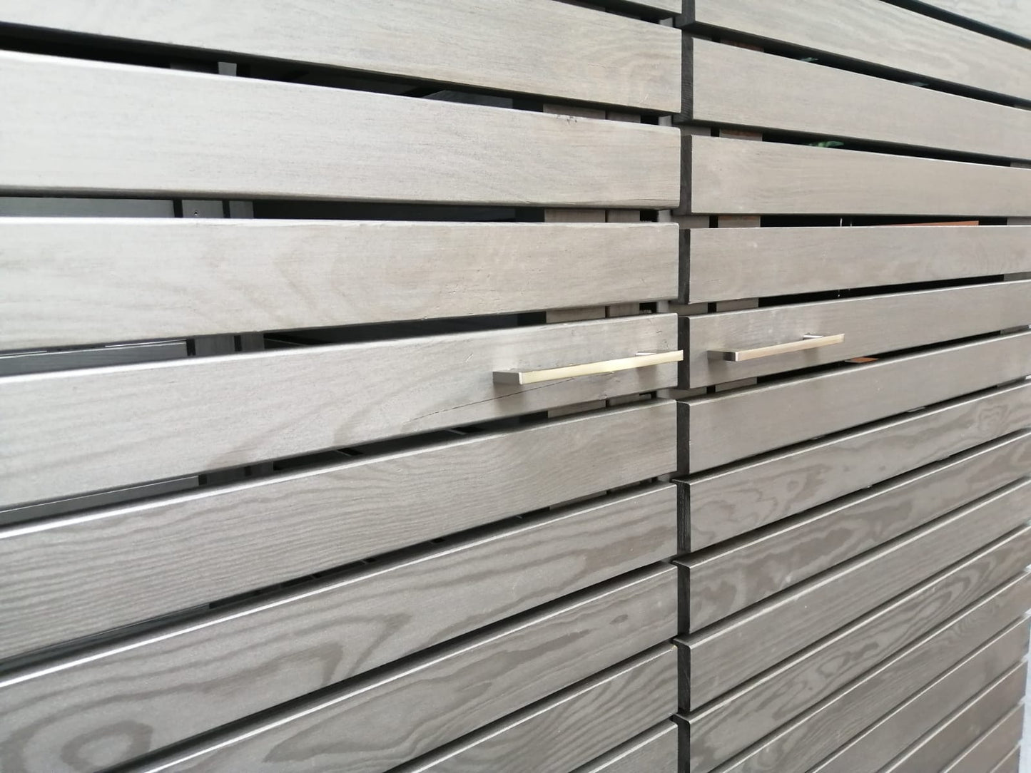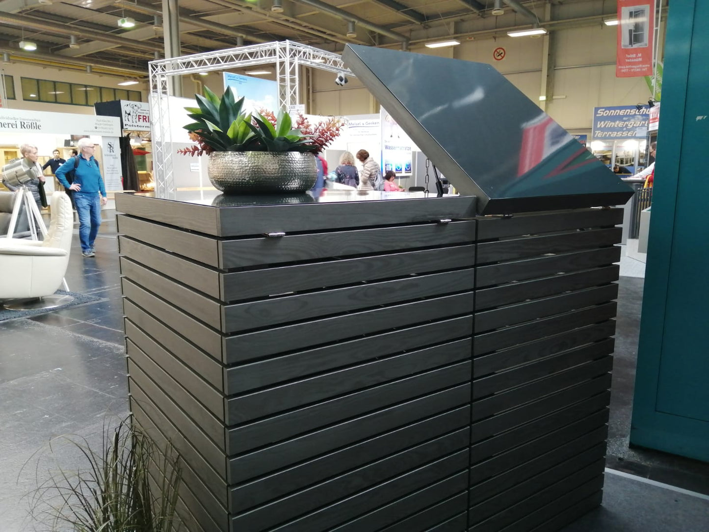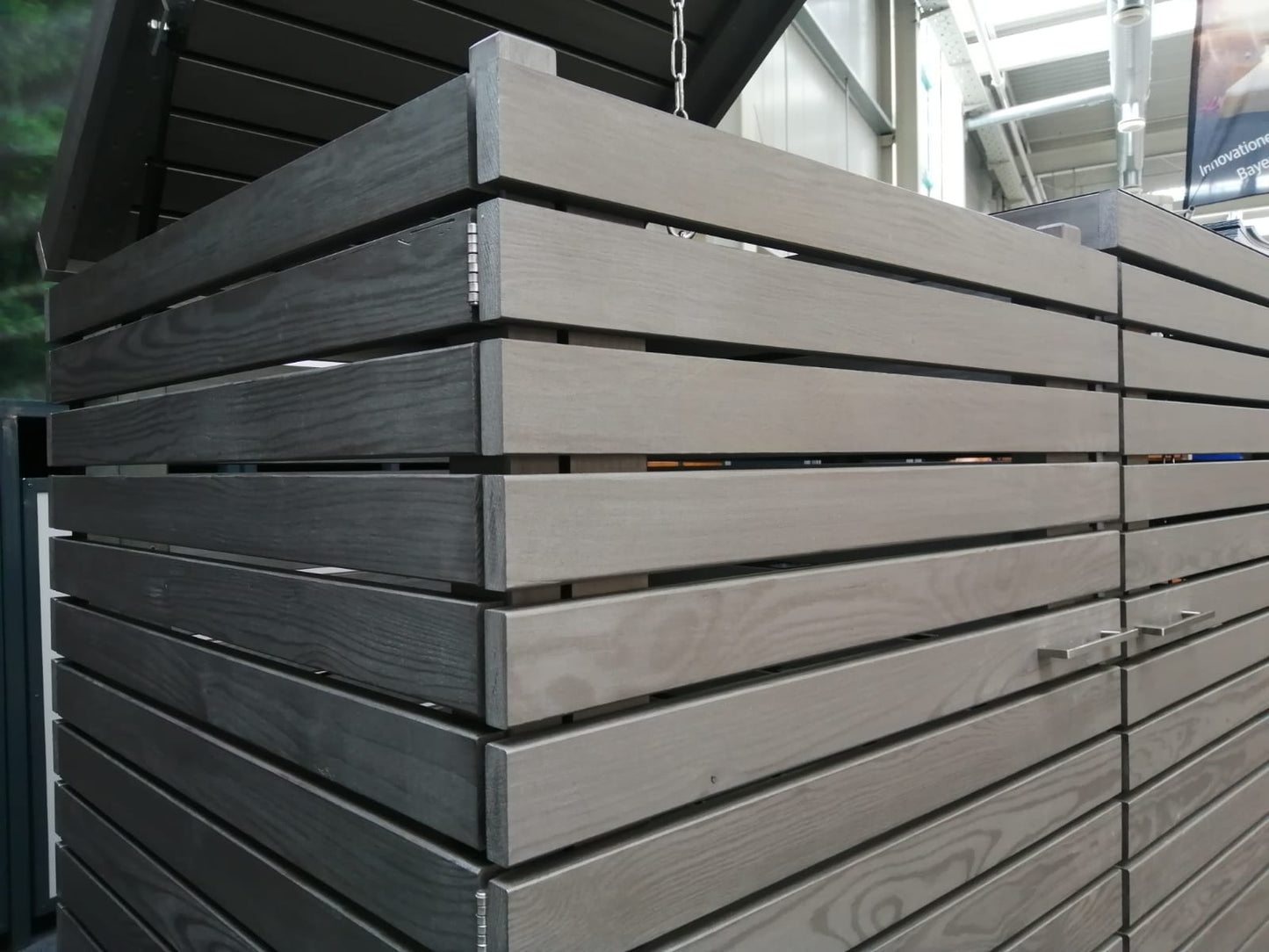 Die Mülltonnenbox besteht aus einem Aluminiumrahmen-Bodenprofil und einer massiven Konstruktion aus Thermkieferholz/ Kieferholz. Damit das Holz nicht dauerhaft mit Bodenwasser in Kontakt kommt, ist die Holzkonstruktion auf dem Alurahmen verbaut. Das Holz wurde mit einer Lasierung in höchster Qualität behandelt und ist in 3 Farben erhältlich. Der Klappdeckel der Mülltonnenbox besteht aus einer massiven Holzkonstruktion, welche mit einer feuerverzinkten Dachplatte welche in RAL 7016 pulverbeschichtet ist, zum Schutz vor Wasser versehen ist. Das Öffnen des Deckels der Mülltonnenbox, öffnet zeitgleich den Deckel der Mülltonne. Im Inneren des Klappdeckels sind zwei Gasdruckdämpfer angebracht, die das Öffnen und Schließen erleichtern.