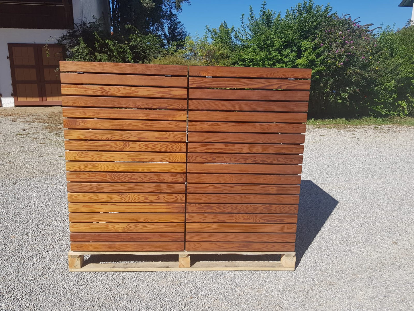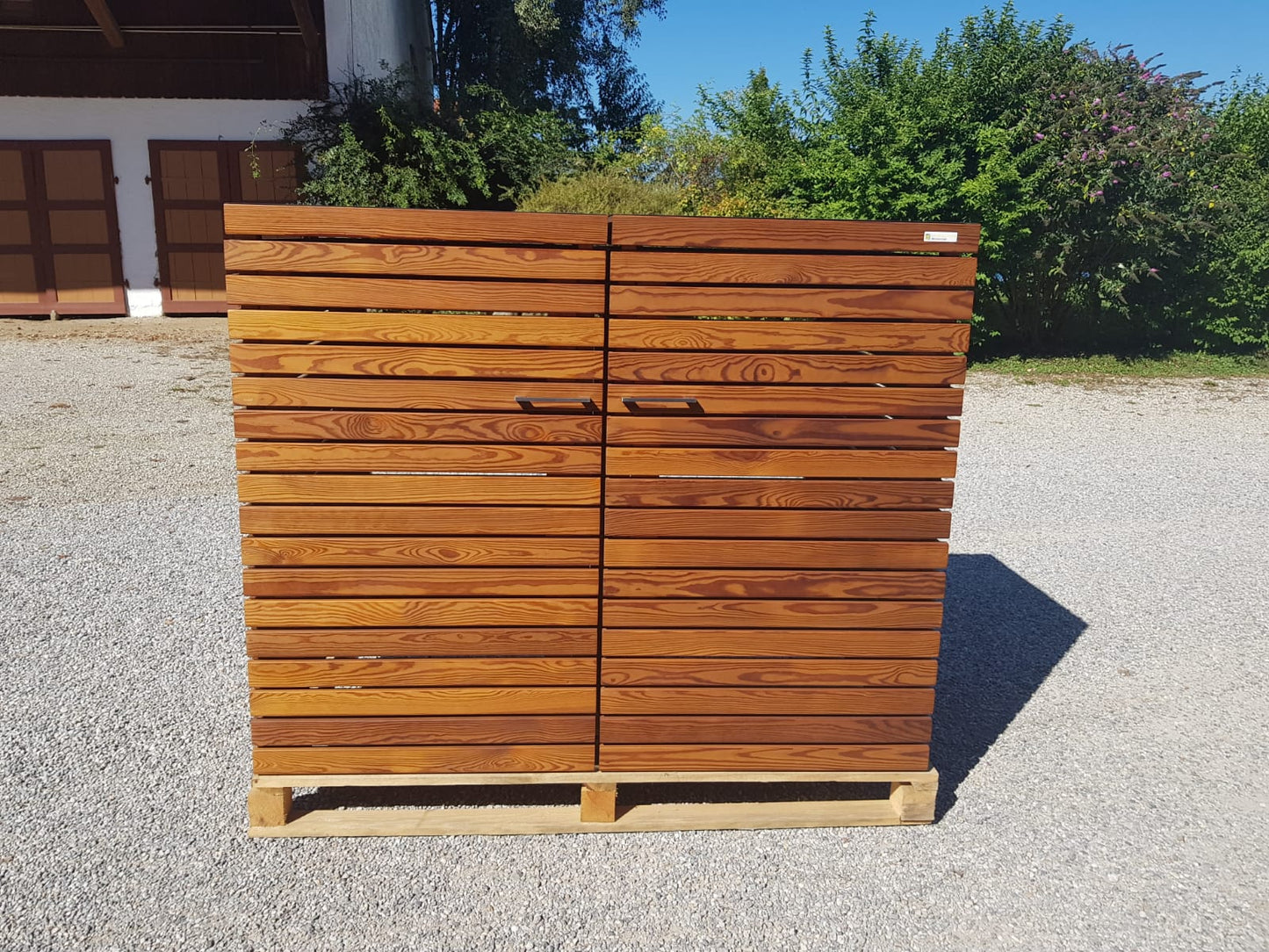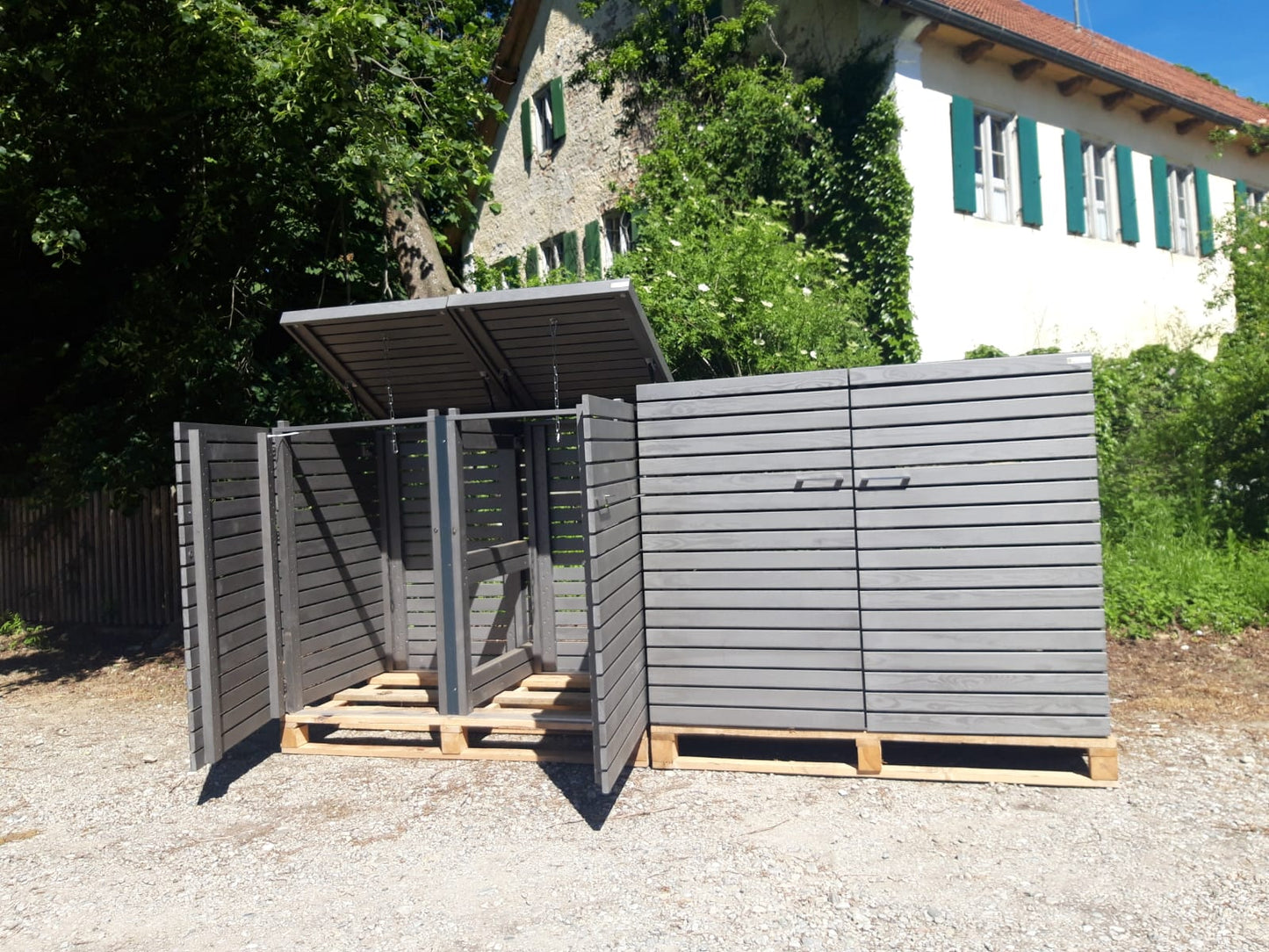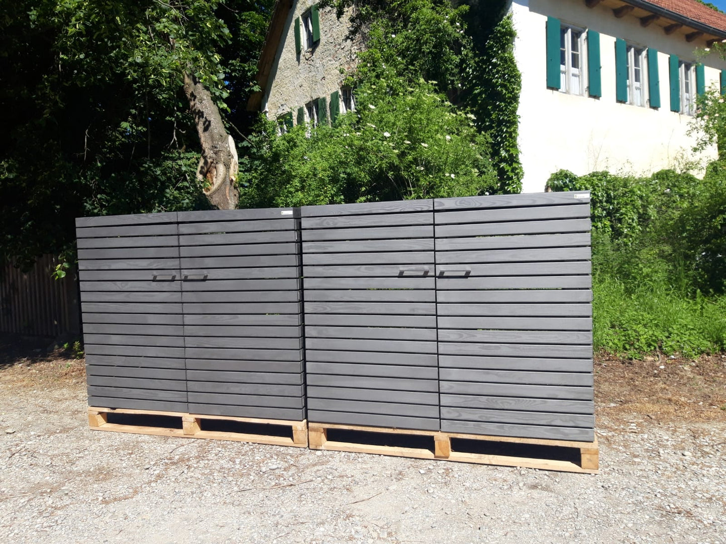Anlieferungszustand: Die Mülltonnenbox wird komplett montiert angeliefert. Bitte prüfen Sie die Ware bei Anlieferung auf Kratzer und Beschädigungen. Die Anlieferung erfolgt verschraubt auf einer Einwegpalette, diese wird nicht zurückgenommen!