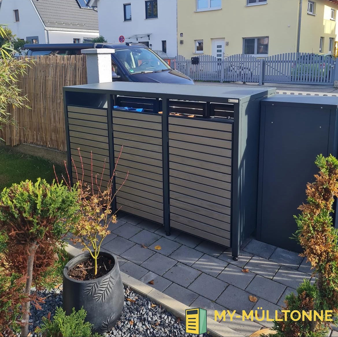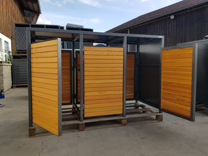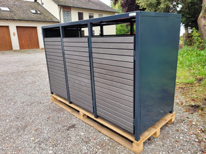 The extremely robust material selected ensures the highest resilience and long service life of the garbage bin box. All components, frames and galvanised sheets are then powder-coated with a German powder paint. You have a standard choice of RAL 7016 anthracite, DB 703 metallic iron mica or RAL 9006 light gray metallic. Of course, we can realize all your colour requests for a small additional charge.