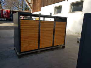 The super high-quality garbage bin boxes with wooden doors offer space for 120 liter or 240 liter garbage bins. The great look is rounded off with a flat roof or plant roof (please add this to the shopping cart). All common wheelie bins according to DIN or EN have space to fit easily into the garbage bin box.