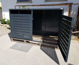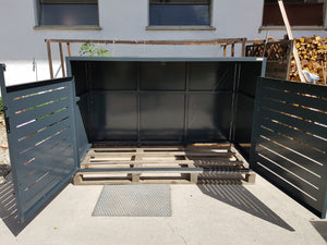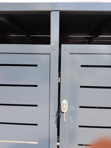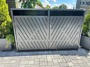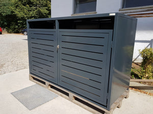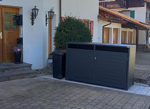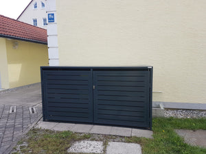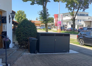 Les coffres à vélo MyMülltonne protègent votre vélo et permettent un stationnement facile et sans problème. Le coffre à vélos est idéal pour les ménages privés, les complexes résidentiels, les entreprises et toutes sortes de lieux. Grâce à ses doubles portes généreuses sans barre centrale (celle-ci s'ouvre avec la porte), il est très facile d'y conduire les vélos. Le coffre à vélo/tout usage n'est pas seulement pratique pour les roues, vous pouvez également y ranger facilement le landau, le gril, le trotteur et les meubles de jardin.