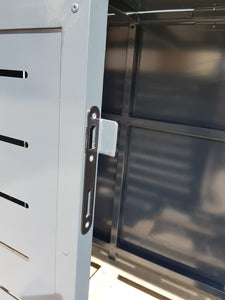 La porte est équipée d'un puissant loquet magnétique, et l'ancre sur l'une des doubles portes permet de la verrouiller. Pour ce faire, l'ancre est insérée dans l'œillet préfabriqué sur le rail au sol. La charnière de la porte est toujours gauche-droite sur un coffre à vélo à double porte.