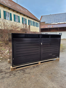 Le matériau extrêmement robuste sélectionné garantit la plus haute résilience et une longue durée de vie du coffre à vélo. Tous les composants, cadres et tôles galvanisées sont ensuite recouverts d'une peinture en poudre allemande. Vous avez le choix standard entre RAL 7016 anthracite, DB 703 mica fer métallisé ou RAL 9006 gris clair métallisé. Bien entendu, nous pouvons réaliser toutes vos demandes de couleurs moyennant un petit supplément.
