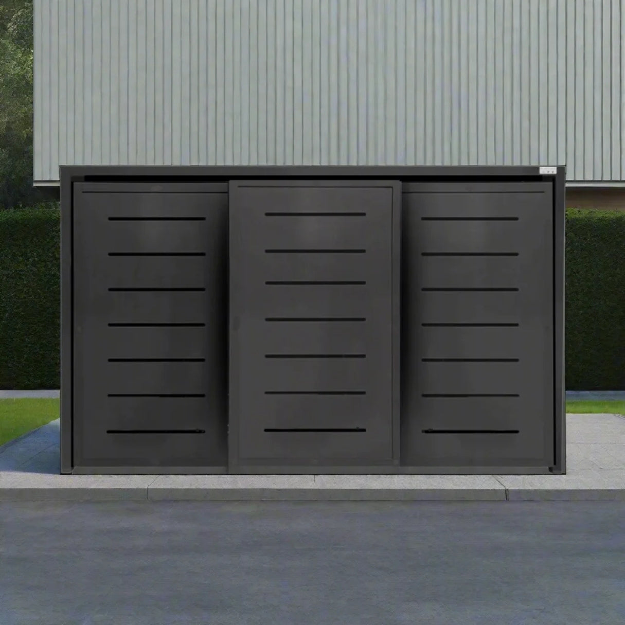 Die MyMülltonne Premium Mülltonnenboxen bieten nicht nur ein ausgezeichnetes Preis-Leistungs-Verhältnis, sondern auch modernes, elegantes Design und höchste Qualität. Unsere PREMIUM Metall 3er Mülltonnenbox mit Schiebetüren bietet Platz für drei 120 Liter oder 240 Liter Mülltonnen. Mit dieser stilvollen Lösung wird Ihr Außenbereich aufgewertet, da die Mülltonnen elegant versteckt werden.