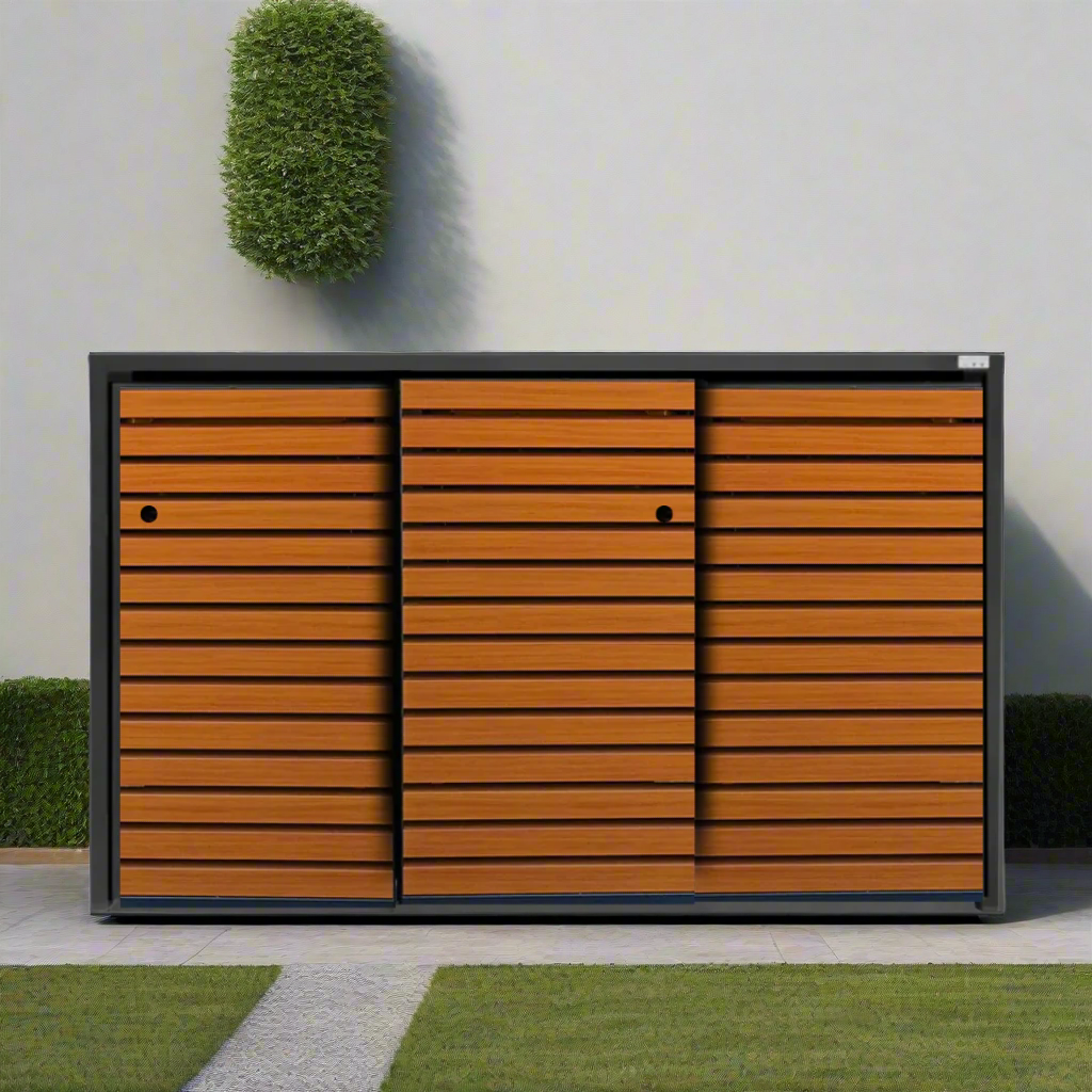 Die MyMülltonne Premium Mülltonnenboxen bieten nicht nur ein ausgezeichnetes Preis-Leistungs-Verhältnis, sondern auch modernes, elegantes Design und höchste Qualität. Unsere PREMIUM Metall 3er Mülltonnenbox mit Schiebetüren bietet Platz für drei 120 Liter oder 240 Liter Mülltonnen. Mit dieser stilvollen Lösung wird Ihr Außenbereich aufgewertet, da die Mülltonnen elegant versteckt werden.
